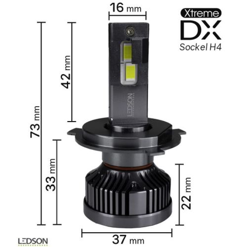 "Ledson Xtreme DX est un kit complet pour la conversion LED de vos ampoules de phares xénon ou halogènes d'origine. Le changement d'ampoule est incroyablement simple puisque le Xtreme DX se connecte directement à votre ballast d'origine actuel (si vous avez du xénon) ou connecté au connecteur d'origine du véhicule (si vous avez un halogène) ! En quelques instants, vous obtenez une lumière jusqu'à 220 % plus puissante avec une lumière nette et un faisceau correct, une durée de vie plus longue d'environ 30 000 heures et un allumage immédiat. Avec Xtreme DX, il est très simple de donner à votre véhicule une lumière beaucoup plus forte et d'éviter de fastidieux changements d'ampoule. Xtreme DX est un kit complet de conversion LED de vos ampoules xénon et halogènes d'origine sur vos feux de croisement et feux de route. Fonctionne pour les voitures (12 V) et les camions (24 V) si vous avez du xénon et pour les camions (24 V) si vous avez de l'halogène. • Convertissez facilement le xénon et l'halogène d'origine en LED • Plug and Play - se connecte directement à votre ballast d'origine (si vous avez du xénon) • Plug and Play - se connecte directement à votre connecteur d'origine (si vous avez un halogène) • Livré avec deux ampoules Xtreme DX pour une conversion complète • Lumière jusqu'à 220 % plus puissante • Faisceau net comme le xénon et l'halogène d'origine • Durée de vie plus longue (30 000 heures) • Température de couleur de 6 000 à 6 500 K • Jusqu'à 6 000 lumens par ampoule • Fonctionne pour 12V et 24V (pour xénon) et 12V (pour halogène) • Canbus sécurisé (pas de message d'erreur sur la plupart des véhicules) • EMC sécurisé (aucune interférence dans la radio) • Refroidissement efficace avec ventilateur + dissipateur thermique • Garantie 36 mois"