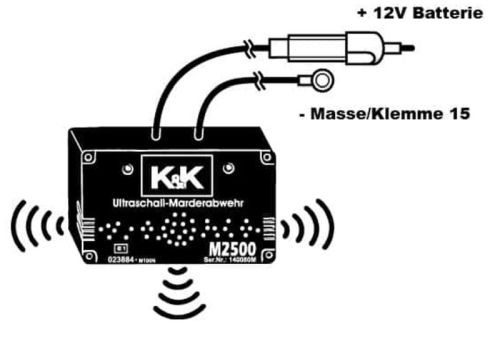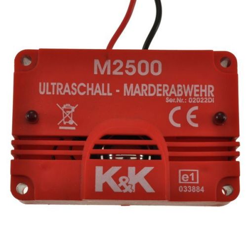"Avec un angle de rayonnement de 180 degrés, le M2500 délivre des ondes ultrasonores là où leur effet protecteur est le plus nécessaire. Les haut-parleurs du M2500 sont spécialement conçus et disposés de manière à ce que les ultrasons sinusoïdaux pulsés soient non seulement diffusés vers l'avant, mais également latéralement à travers des fentes spécialement conçues. Les ondes sonores se propagent comme la lumière, mais les obstacles peuvent les bloquer. Une « ombre acoustique » se développe alors, qui ne reçoit pratiquement aucune pression sonore. Pour les martres, l’ombre acoustique est la cachette idéale. Les haut-parleurs spécialement conçus du M2500 le rendent très efficace sur une large zone. Cela fait du jeu de cache-cache dans le compartiment moteur un exercice futile pour la martre. Échographie sinusoïdale pulsée: Nos effaroucheurs imitent les cris d'avertissement des animaux de manière très sonore et très réaliste. Cela sert à éviter l’effet d’accoutumance. vagues à 180°: Les ondes ultrasonores propagent la lumière vers l'avant, c'est-à-dire que le son est à peine perceptible derrière les obstacles ou sur les côtés. La manière particulière dont le haut-parleur est conçu et placé signifie que les tonalités sinusoïdales ultrasoniques agressives sont émises dans un angle de faisceau de 180 degrés. Bus CAN: L'électronique des véhicules modernes communique en interne via ce que l'on appelle un bus CAN. Même dans cet environnement, nos appareils peuvent fonctionner sans aucune difficulté. Compatible hybride Nos appareils peuvent également être facilement installés dans des véhicules hybrides. Marque E1: Le signe E-1 confirme que l'appareil a été testé par la Federal Motor Transport Authority (KBA). Plastique résistant aux acides et auto-extinguible L'appareil résiste aux acides (par exemple les piles ou les produits de nettoyage) et le plastique utilisé répond aux normes de sécurité de l'industrie automobile. 105dB 2mA - 11-15V Le M2700 doit être installé dans le compartiment moteur de manière à ce que le dôme émette le plus de signaux possible aux points d’entrée des martres et dans les zones sujettes aux morsures. Veuillez vous assurer qu'il y a un espace libre devant le boîtier du dôme afin que les ultrasons puissent se propager aussi loin que possible. Ne pas installer directement sur le collecteur d'échappement ou directement à côté du moteur en raison d'une chaleur excessive !"