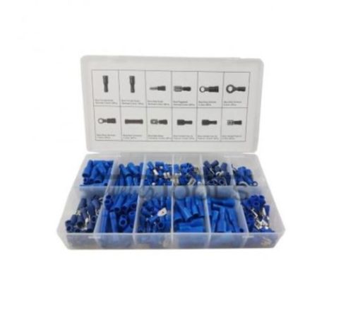 "Assortiment de 280 connecteurs de câbles isolés bleus. Cosses à œillet 4,3 mm - 30 pièces Cosses à œillet 5,3 mm - 30 pièces Cosses à œillet 6,4 mm - 20 pièces Fiches plates 6,3 mm - 30 pièces Manchons connecteurs plats 6.3mm - 30 pièces Manchons connecteurs plats 6,3 mm (entièrement isolés) - 30 pièces Connecteurs bout à bout 4mm - 30 pièces Connecteurs boule Mâle 5mm - 30 pièces Connecteurs boule Femelle 5mm - 30 pièces Répartiteur de cosse de câble 6,3 mm - 20 pièces"