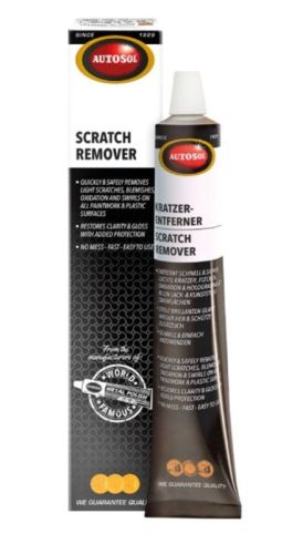 "AUTOSOL® SCRATCH REMOVER pour les surfaces en verre plastique et peintes telles que les vitres arrière de cabriolets, les visières de casques de moto, les écrans de téléphones portables, les verres de montre, les fenêtres d'avion, les bateaux et les rayures légères sur les surfaces peintes. Élimine les fines rayures du verre plastique et de la peinture automobile. Donne une belle brillance et protège des intempéries. Autosol Anti-rayures pour vitres en plastique telles que les vitres arrière des cabriolets, les visières de casques de moto, les écrans de téléphones portables, les lunettes de montre, les vitres d'avion et de bateau. Élimine la saleté et les fines rayures. Il laisse derrière lui une couche protectrice brillante qui offre une protection contre les intempéries. Élimine également les très légères rayures sur les surfaces peintes comme sous la poignée de porte des voitures."
