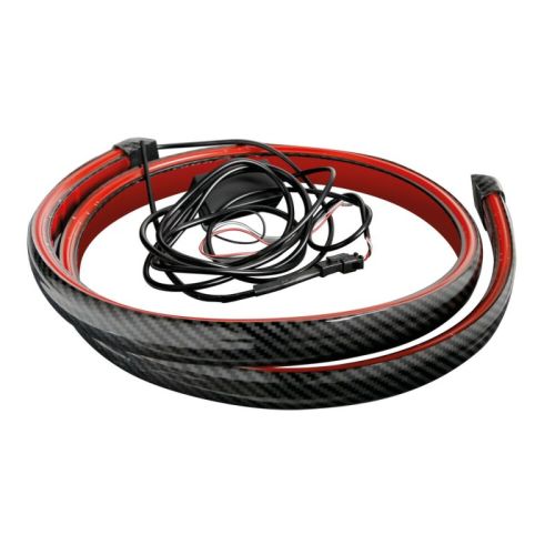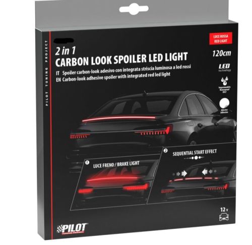 "• Spoiler adhésif aspect carbone avec lumière LED rouge intégrée - 120 cm - 12V • 2 fonctions : feu de position (fonction séquentielle à l'activation) et feu stop (faisceau lumineux de plus forte intensité) • Utilisation arrière, pour montage sur toute surface lisse (toit, spoiler, coffre, pare-chocs…) • Améliore l'esthétique de la voiture. • Augmente la visibilité de la voiture pendant la conduite assurant une plus grande sécurité. • Fixation simple par adhésif sans perçage • Fabriqué en PVC flexible de haute qualité. • Étanche IP67 et résistant aux lavages de voiture"