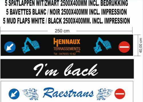 Prix pour 5 bavettes 2500x400mm. inclus impressions en couleur RAL. (commande min. 5 pc) Impression machinale en couleurs RAL . Veuillez choissir le couleur RAL et type de lettres en avance. Logo's sont que ussable en format digitale : EPS / AI / CDR / PDF delai : +- 4 semaines après paiement. Une exemple sera envoyé pour vérification avant production.