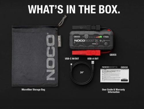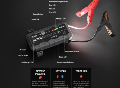 "• Courant de démarrage 1 750 ampères (crête) • Types de batterie Batteries au plomb de 12 volts • Batterie interne au lithium-ion de 46 watts-heure • Entrée USB USB-C : 5 V 1,5 A/9 V 3 A/12 V 3A/15 V 3A/20 V 3A • Sortie USB USB-A : 5 VDC 2,1 A max/10 W max • USB-C : 5 V 3 A/9 V 3 A/12 V 3A/15 V 3A/20 V 3A • Moteur à essence de 7,5 litres • Moteur diesel de 5,0 litres • Lampe de poche LED 200 Lumens •Taille du produit Hauteur : 7,7 pouces (195 mm) Largeur : 4,9 pouces (124,46 mm) Profondeur : 2,5 pouces (63,50 mm) Poids : 2,58 lb (1,17 kg) X for Extreme - Un tout nouveau design avec une puissance de démarrage extrême pour des démarrages rapides et puissants des moteurs. Présentation d'un nouveau type d'expérience de démarrage rapide, avec notre dernière technologie PX Lithium qui offre une puissance incroyable, une charge ultra-rapide et une polyvalence inégalée. Ce n'est pas une mise à niveau. C'est une toute nouvelle série - BOOST X avec plus de puissance de démarrage. Le nouveau Boost X combine une puissance énorme avec une facilité d'utilisation inégalée, une polyvalence et une conductivité maximale. Turbo Chargeable - Boost X est équipé de la technologie USB-C qui, combinée à une alimentation électrique, vous offre des recharges ultra-rapides. Se recharge complètement en 48 minutes, ou passez de 0 % à un démarrage rapide en seulement 5 minutes de charge. Tout alimenter - Avec USB-C Power Delivery, vous avez le pouvoir de recharger presque tout. Sa banque d'alimentation interne fournit 60 watts de puissance - à la fois en entrée et en sortie - pour alimenter sans effort nos appareils USB-C préférés, comme les téléphones, les tablettes, les ordinateurs portables, les appareils portables, etc. UltraSafe 2.0 - Nous avons pris notre technologie UltraSafe et l'avons améliorée. C'est toujours notre conception simple et sans erreur dotée d'une technologie anti-étincelles et d'une protection contre l'inversion de polarité, mais avec une efficacité thermique et une gestion de l'alimentation améliorées pour offrir de meilleures performances et une durée de vie de la batterie plus longue. Compatible - Boost X est l'un des démarreurs les plus polyvalents jamais créés avec une puissance de démarrage de 1750 ampères pour des moteurs à essence jusqu'à 7,5 litres et des moteurs diesel de 5,0 litres. Voici ce que vous obtenez avec Boost X - GB55 UltraSafe Portable Lithium Car Battery Booster Jump Starter Pack avec 60 W USB-C Power Delivery, serre-câbles intégrés robustes, câble de charge USB-C, sac de rangement en microfibre. • Démarreur au lithium compact mais puissant évalué à 1750 A • Une conception ultra-sûre et à l'épreuve des erreurs avec une technologie anti-étincelles et une protection contre l'inversion de polarité, qui lui permettent de se connecter en toute sécurité à n'importe quelle batterie • Une lampe de poche LED ultra-lumineuse de 200 lumens avec 7 modes d'éclairage, y compris SOS et stroboscopique d'urgence • Rechargez vos appareils personnels lors de vos déplacements, comme les smartphones, les tablettes, les montres électroniques et plus encore - jusqu'à 4 recharges de smartphone • Conçu pour les moteurs à essence jusqu'à 7,5 litres et les moteurs diesel jusqu'à 5,0 litres pour voitures, bateaux, tondeuses à gazon et plus"