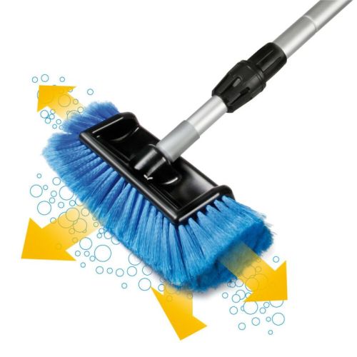 "• Jeu de brosses télescopiques 3D, pointe de verrouillage à vis • Brosse 30x16 cm à poils souples anti-rayures spécifique pour carrosseries peintes. • Ourlets arrondis en plastique pour éviter les rayures. • Télescopique (133-250 cm), poignée en aluminium (Ø 30 mm) • Pointe de verrouillage de vis en métal • Prise caoutchoutée • Robinet d'eau et raccord rapide inclus. "