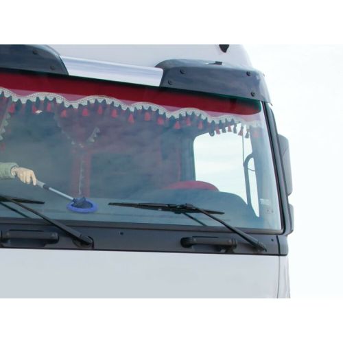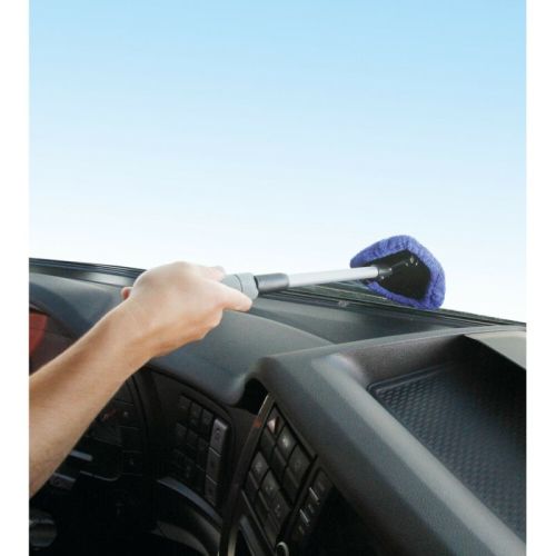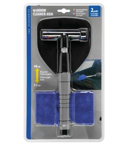 "Bras lave-vitre - 13x14,5 cm Enlève la saleté des fenêtres intérieures. Articulation pivotante pour atteindre facilement tous les coins. Bras télescopique de 33 à 48 cm. 2 tampons en microfibre de rechange, lavables en machine "