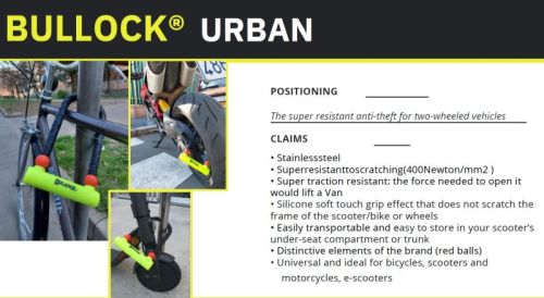 "Bullock® Urban est l'antivol super résistant pour les véhicules à deux roues. De plus, il est revêtu de silicone à effet « grip soft touch » pour éviter les griffes sur les châssis et les jantes. • Super résistant • Léger et maniable • Anti-griffes • Facile à transporter"