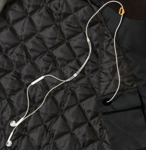 "Chauffe-corps doublé 100% polyester Oxford 300D résistant à l'eau Doublure intérieure matelassée 100% polyester Col doublé de microfibre Bandes réfléchissantes de 5 cm autour du corps, ainsi que bandes verticales à l'arrière du col 1 poche portefeuille zippée 1 poche téléphone avec passe-fil 2 poches extérieures avec fermeture à rabat et 3 poches zippées Porte-clés sur la poitrine Zip frontal complet avec menton Cordon ajustable en bas du vêtement Extérieur 100% polyester Oxford À l'intérieur du sac en taffetas 100% polyester doublé / matelassé"