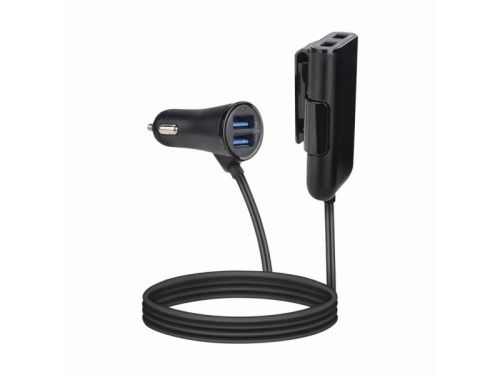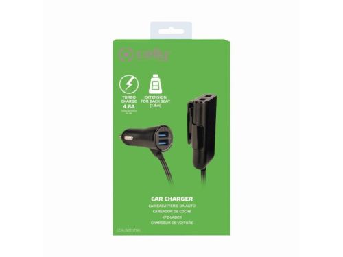 "Chargeur de voiture Celly avec 4 ports USB pour charger rapidement jusqu’à 4 appareils simultanément, idéal pour les voyages entre amis ou avec votre famille. Le chargeur est équipé de 2 ports USB sur la face avant et d’une extension de câble (1,6 mètre) avec 2 autres ports USB accessibles pour les sièges arrière, de sorte que tous les passagers puissent facilement charger leurs appareils. Le clip pratique sur l’adaptateur vous permet d'attacher le chargeur sur la poche arrière du siège avant. Chargeur de voiture avec 4 ports USB 2 ports USB sur la face avant et une extension de câble de 1,6 m Clip d'attache pratique"