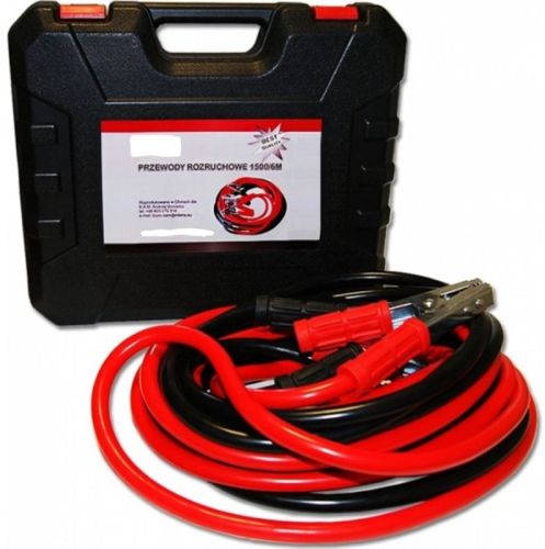 "• poids unitaire 4,7 kg • longueur 6 m, section transversale 35 mm2, • diamètre extérieur du câble 15 mm • courant maximum 1500A, certificat CE • marquage (-) noir, marquage (+) rouge • emballage dans une valise confortable"