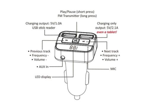 "Avec l'émetteur Caliber FM pour voiture, vous pouvez passer des appels téléphoniques et écouter votre musique préférée. Grâce à la fonction kit voiture et au microphone intégré, vous pouvez facilement passer des appels mains libres dans la voiture. L'émetteur dispose de 2 ports USB, dont le 2ème sert uniquement au chargement. Grâce à l'entrée AUX, vous pouvez écouter de la musique depuis votre téléphone via l'émetteur-récepteur. L'émetteur est livré avec une télécommande pour que vous puissiez l'utiliser facilement. L'émetteur dispose également d'un panneau de boutons. Caractéristiques: Émetteur FM Transmet le signal MP3 et WMA 2 x USB pour le chargement et la musique Entrée AUX Fonction kit voiture Micro intégré Un accessoire indispensable Un émetteur FM pour votre voiture est très utile. L'expéditeur permet de profiter de votre liste de musique préférée. Il est possible d'appeler des gens tout en se concentrant sur la conduite. C'est très sûr sur la route. L'écran LED de l'émetteur affiche des informations utiles. Cela permet de voir quelle chanson est en cours de lecture et quelle est la tension de la batterie. Appels mains libres L'émetteur FM permet de passer des appels mains libres. Grâce au microphone intégré, vous pouvez passer des appels téléphoniques d'une clarté cristalline. L'émetteur dispose d'une fonction kit voiture qui diffuse la conversation téléphonique via les haut-parleurs de votre radio. Cette fonction est non seulement très utile, mais elle est aussi beaucoup plus sûre pendant la conduite. Écouter de la musique Un émetteur FM permet d'écouter facilement de la musique dans la voiture. Vous pouvez utiliser l'entrée AUX pour connecter votre téléphone et lire des fichiers MP3 et WMA jusqu'à 64 Go. Utilisez l'écran pour mettre en pause ou écouter de la musique, ou utilisez la télécommande. Vous pouvez utiliser le port USB avec une sortie de 5 V/2,1 A pour charger votre téléphone, tandis que vous utilisez l'autre port pour une clé USB avec de la musique. Compris: Émetteur FM de calibre Télécommande"
