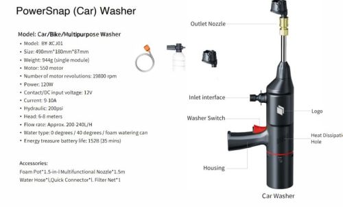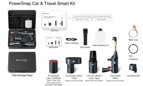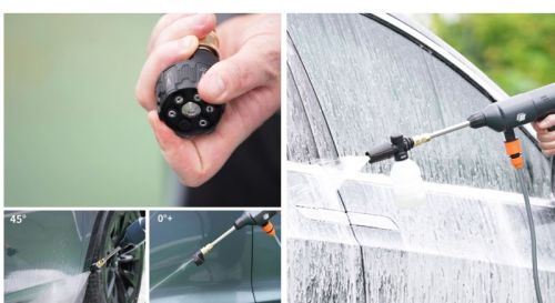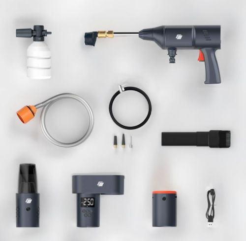"• Nettoyeur haute pression/Récipient à mousse + Gonfleur de pneus + Aspirateur • Sans fil avec batterie externe incluse • Le tout dans un élégant coffret luxueux • Rechargeable Contenu : 1 nettoyeur haute pression, 1 tuyau d'aspiration, 1 récipient à mousse, 1 aspirateur, 1 brosse, 1 rallonge d'aspirateur, 1 gonfleur de pneus, 1 tuyau de raccordement pour gonfleur de pneus, 3 accessoires pour gonfleur de pneus, 1 batterie, 1 câble USB-C"