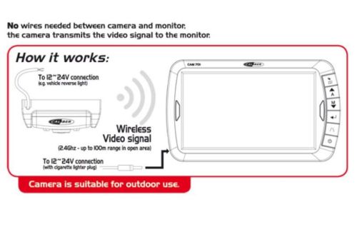 "Monitor: • 7” TFT color display with split screen option (when two cameras are connected) • resolution 800(W) x 480(H) • 12~24V input voltage (cigarette lighter plug) • digital wireless receiver (2.4Ghz) • system expandable up to 2 cameras (second camera sold separately) • with dashboard stand, including fully adjustable arm and monitor quick release • with mounting straps, for e.g. placement on the inside of the sun visor Digital camera: • 12~24V input voltage • digital wireless transmitting (2.4Ghz - up to 50m range in open area) • water and weather resistant (IP66) • autofocus and white balance • 6UV LEDs"