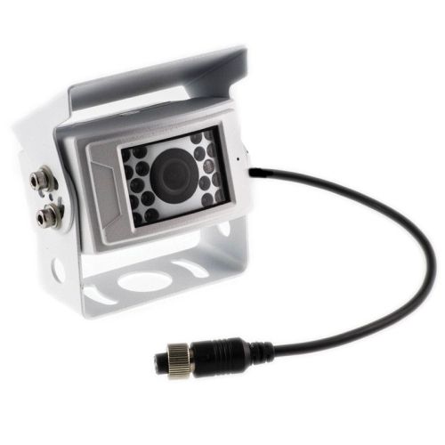 Couleur blanche Robuste Vision nocturne Orientation arrière Grand angle Étanche Universel Câble de 20 m inclus 12/24 V Câble AV 20 m (4 broches) Câble d'alimentation 800 mm 700 lignes TV PAL Champ de vision H120°/V170° Indice de protection IP67 Infrarouge Microphone 1 adaptateur RCA 4 broches L x H x P x P : 85 mm