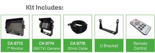 "MONITOR •7” (178mm) Digital TFT Panel Monitor •Display Resolution 800RGB(H) x 480(V) DOT •NTSC/PAL (Auto Switch) •OSD Menu: Brightness; Contrast; Colour; Mode; Language Setting; Mirror; Guideline; Reset •Audio 0.2~0.4A / <10w •Video 2AV / Brightness: 300cd/m2 / Contrast: 350:1 •9 Pin Cable Connection •1.5m Cable •U Bracket Mount •12-32 Volts •Reverse Polarity Protection; •Sun Visor; •extra camera possible: 03398938 -Separately supply DC12V to each camera •177mm*122mm*26mm •CE Approved CAMERA •CMOS •12 /24 Volts •NTSC: 720*576, PAL: 720*487 •Horizontal Resolution (TV Lines): 550TVL •Audio Function •Built-In Lens 2.8mm •18 Infrared LEDs •10m Night Vision •120° Viewing Angle •Video Output: 1.0Vpp / 75O •4 Pin Cable Connection •550mm Cable •Metal Bracket Mount •Operating Temperature -20°C ~ +70°C •70mm*45mm*60mm •Rated IP69 •CE Approved 20 m cable "