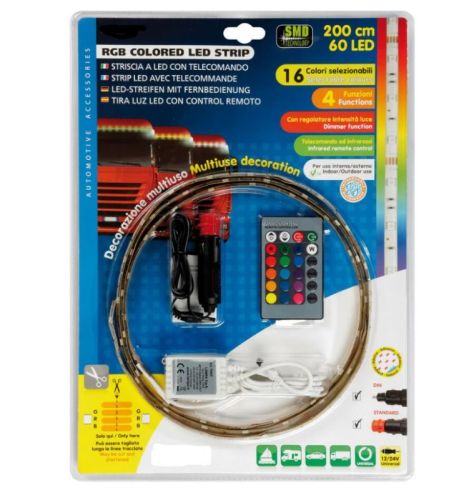 "• 12V+24V • 60 LED, 16 couleurs sélectionnables. • Utilisation étanche, intérieure ou extérieure • Multifonction, 4 motifs lumineux différents. • Fonction gradateur. •Télécommande infrarouge. • Fonction mémoire : conserve le dernier réglage pour les prochains allumages •Longueur : 200 cm - Peut être coupé selon les besoins (tous les 10 cm) • Différentes couleurs possibles (Rouge-vert-orange-bleu-violet-jaune-blanc...) "