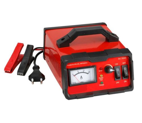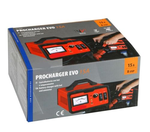 "Procharger Evo 15 A, chargeur de batterie 12/24 V Chargeur intelligent 8 phases avec LED et ampèremètre Contrôle par microprocesseur et circuit intégré Fonction de charge d'entretien continue Fonction de diagnostic et de récupération pour batteries déchargées jusqu'à 4 V. Protections contre les inversions de polarité, les surcharges, les courts-circuits et la surchauffe Boîtier métallique Pour batteries plomb-acide STD, GEL, Start&Stop AGM, EFB Pinces de batterie Étanchéité IP20"