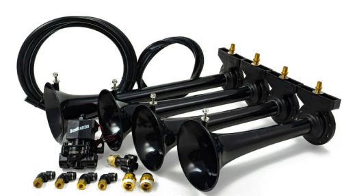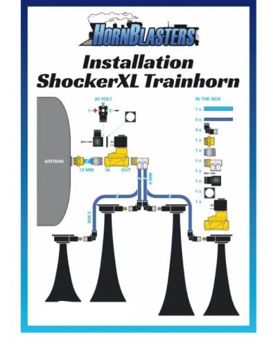 "Le Hornblasters ShockerXL Trainhorn est le cornet de train que vous devez avoir. Le son le plus fort et le plus beau avec une pression atmosphérique de 8 bars ! - Set Trainhorn des USA, adapté pour les camions européens ! - Tous les raccords et conduites d'air européens, du réservoir d'air aux klaxons, sont inclus - Des instructions claires rendent l'installation très facile - Pression d'air minimale 8 bars Dimensions: Corne 1 : 32,4 cm Corne 2 : 37,5 cm Corne 3 : 41,3 cm Corne 4 : 49,5 cm"