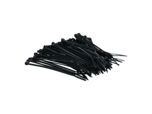 "Colliers de serrage universels en plastique noir. Longueur 100 mm, largeur 2,5 mm. Avec une fermeture en plastique et une languette de verrouillage incurvée en plastique pour une insertion facile. Résistants aux UV, à la traction et à des températures de -40° à +85°C. Par 100 pièces. • Longueur 100 mm, largeur 2,5 mm • Languette de verrouillage incurvée en plastique pour une insertion facile • Résistants aux UV et à des températures de -40° à +85°C"