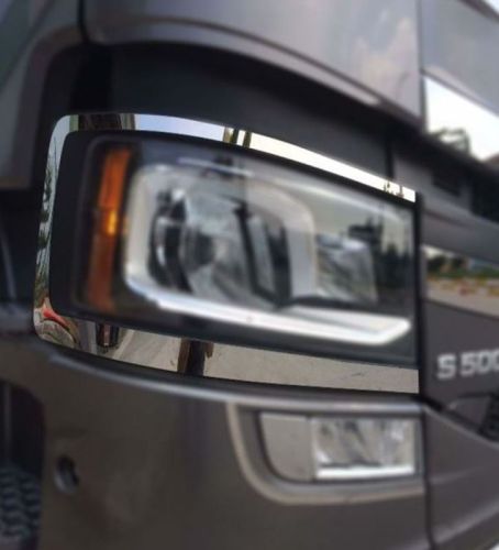"Applications en acier inoxydable super miroir pour Scania R/S 2016->. A appliquer sur le contour du phare. Le kit se compose de deux pièces, gauche et droite, et comprend un adhésif double face."