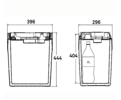 12V+24V / Dimensions : 396 x 394 x 296 mm / 4 kg / 25L / hauteur debout pour bouteilles de 2L • Refroidit jusqu'à 18 °C maximum en dessous de la température ambiante ! • Espace vertical pour bouteilles de 2 litres • Poignée de transport à deux fonctions : support et verrouillage du couvercle • Les câbles sont intégrés dans le couvercle • Connexion USB pour charger les équipements mobiles