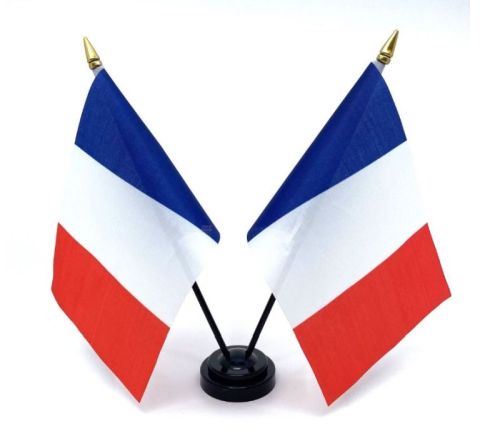 Ensemble de deux drapeaux de table. L'ensemble se compose de deux drapeaux et d'un porte-drapeau noir. Hauteur des drapeaux : 28cm. Largeur des drapeaux : 20 cm