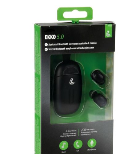 "Ekko 5.0, écouteurs Bluetooth stéréo sans fil avec boîtier de charge Léger et confortable, écoutez de la musique et répondez aux appels sans vous encombrer de fils et en toute liberté. Grâce aux commandes de la presse, il est possible de gérer les morceaux de musique et les appels entrants. L'étui de charge vous permet de recharger les écouteurs jusqu'à 3 fois. Câble de charge inclus. Version Bluetooth 5.0. 4 heures de musique et d'appels, 200 heures d'autonomie en veille"