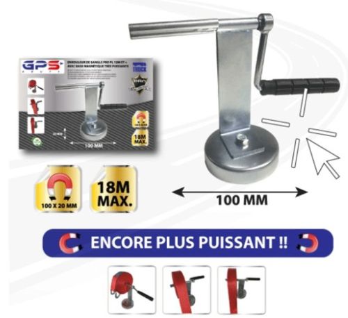 "• base aimantée magnétique très puissante, diamètre 10cm sur 2cm hauteur • acier solide et robuste traité chromé • pour tout type de sangle 12 mètres et + (max 18 mètres) • Poids : 9.6 kg • Dimensions (lxPxH) : 280 x 110 x 200 mm"