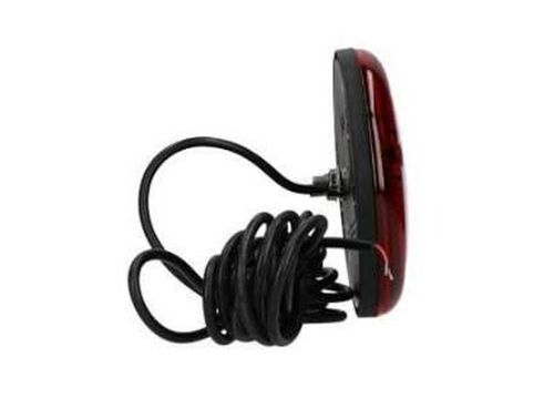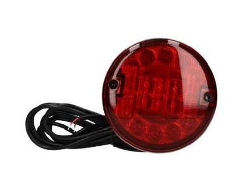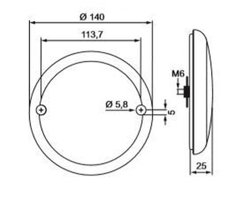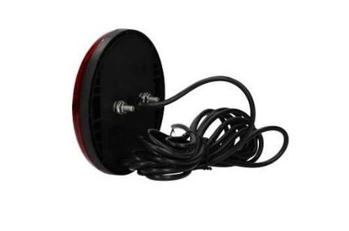 "Feu antibrouillard arrière LED, 12/24V plat. Diamètre: 140mm Ø Hauteur: 31mm entraxe: 45mm boulons: M6. Connexion: câble 5.0M avec extrémité ouverte; couleur du fil conformément aux instructions d'installation fournies. IP67. Livré avec un ensemble chromé avec anneau en plastique et joint en caoutchouc. "
