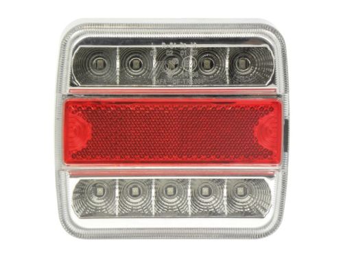 "Feu arrière 10 LED. Homologué CE. Peut être monté à la fois à gauche et à droite. 5 fonctions : feu stop, clignotant, feu arrière, éclairage de plaque d'immatriculation et réflecteur. Visserie incluse avec entraxe de 55 mm. Dimensions 100x100x37 mm. Montage à la fois à gauche et à droite 5 fonctions : feu stop, clignotant, feu arrière, éclairage de plaque d'immatriculation et réflecteur 10 LED. Dimensions 100x100x37 mm 12V"