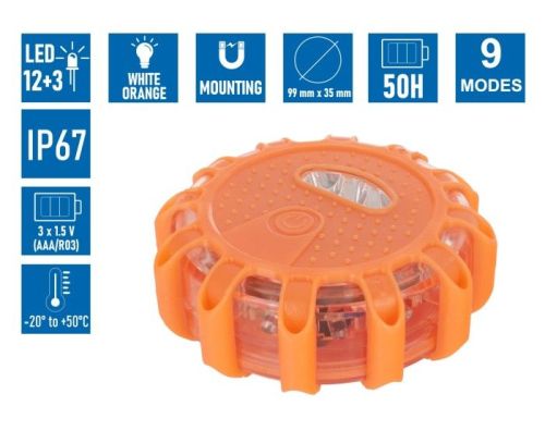"Une lampe torche est un dispositif d'éclairage portable utilisé pour signaler un danger, notamment dans des situations d'urgence ou dans des conditions difficiles telles que des accidents de la route, des pannes de véhicules, etc. La lampe Flare utilise des diodes électroluminescentes (DEL) comme source de lumière. Les LED sont économes en énergie, durables et fournissent une lumière vive clairement visible même dans des conditions difficiles. La lampe est en forme de disque et possède un boîtier fait de matériaux durables et résistants aux intempéries. LED 12+3 La lampe est équipée de 12 LED orange et de 3 LED blanches supplémentaires. Les LED se caractérisent par une lumière vive et économe en énergie, durable et durable. Support magnétique intégré à la base La lampe peut être facilement fixée sur des surfaces métalliques grâce à l'aimant intégré dans la base. Cela lui permet d'être fixé sur une voiture, une machine ou tout autre objet métallique pour signaler ou éclairer une zone. Crochet pour accrocher la lampe Un crochet supplémentaire permet d'accrocher la lampe, ce qui est utile lorsqu'il n'y a pas de possibilité de la monter sur un aimant 9 modes d'éclairage 3 piles AAA (NON incluses)"