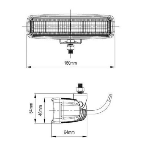 2520 Lumens 10-32 Volts 30 Watts 6 x 5W LEDs IP67 Rated ECE Reg 10 | Reg 148 Polycarbonate Lens Die Cast Aluminium Base Stainless Steel Bracket Mount Plug In Connection 450mm Cable Flood Beam 54m Beam Distance Operating Temperature: -40C to +50C Dimensions: 160*64*54mm Current Draw @ 12V: 2.14A Current Draw @ 24V: 1.02A