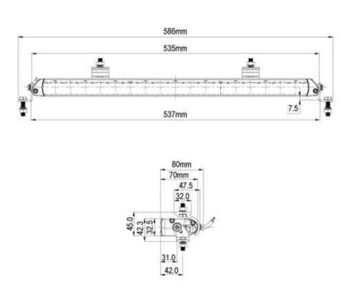 7560 Lumens 12-28 Volts 90 Watts 18 x 5W LEDs IP67 Rated ECE Reg 10 | Reg 112 Polycarbonate Lens Die Cast Aluminium Base Stainless Steel Bracket Mount Plug In Connection (Deutsch) 450mm Cable Spot Beam 450m Beam Distance Operating Temperature: -40C to +50C Dimensions: 535*70*32.5mm Current Draw @ 12V: 6.22A Current Draw @ 24V: 2.90A
