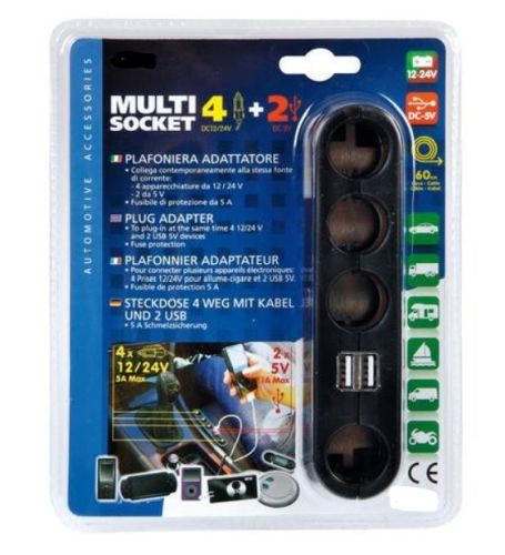 "Output: 4 x 12/24V (5A max) lighter sockets, 2 x USB - (1A max) socket for mp3 players, pda, phones, gps, etc. Protection fuse. 60 cm cable"