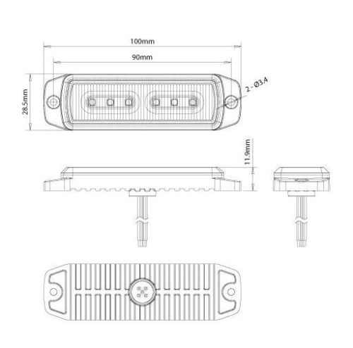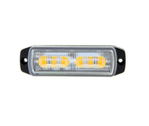 12-24 Volts 18W (6 x 3W) 6 LEDs / Amber Rated IP69K Nominal Current @ 12V: 1.2A Nominal Current @24V: 0.6V 19 Flash Patterns PC Lens (Clear) / Aluminium Base Surface / Screw Mount 200mm Cable 90mm Bolt Distance ECE Approved Reg 10 / Reg 65 (Class 2) Dimensions: 100*28.5*11.9mm Operating Temp.: -45°C to +60°C