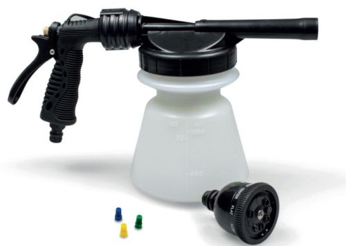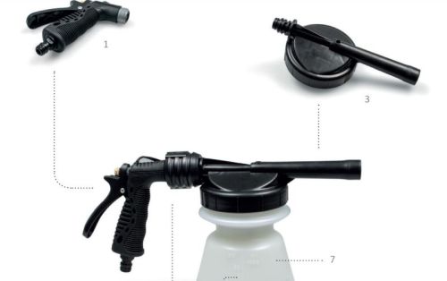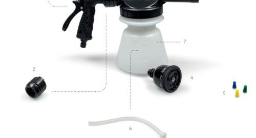 "Idéal pour l’application de produit de nettoyage et de désinfectant. Dilue le produit automatiquement avec l’eau. Surdosage et gaspillage impossibles. Fonctionne sans électricité. La pression du réseau de distribution d’eau fournit l’énergie pour la dilution. Génère une mousse épaisse et riche pour un plus long contact et un temps de pose accru du produit. Pour le rinçage, il suffit de déconnecter le pistolet du réservoir à l’aide du raccord rapide et de monter la buse à 9 jets. La dilution est contrôlée par des bagues colorées de tailles différentes."