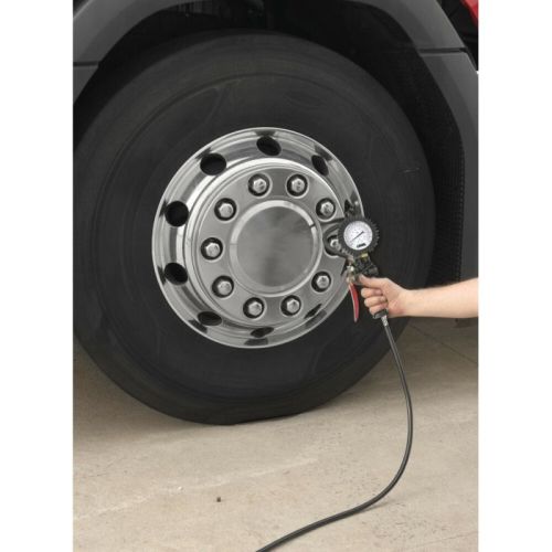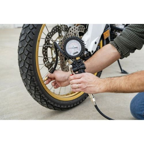 "• Gonfleur de pneus avec jauge haute précision 270° - max 12 bar / 170 psi • Série professionnelle • Pour gonfler/dégonfler les pneus et mesurer leur pression • Échelle graduée linéaire de 270° avec pas de graduation de 0,1 bar / 0,2 psi • Coque de protection en caoutchouc • Levier de gonflage et poignée ergonomique • Connecteur d'air à connexion rapide • Tuyau en caoutchouc de 30 cm • Tête d'accouplement rapide"