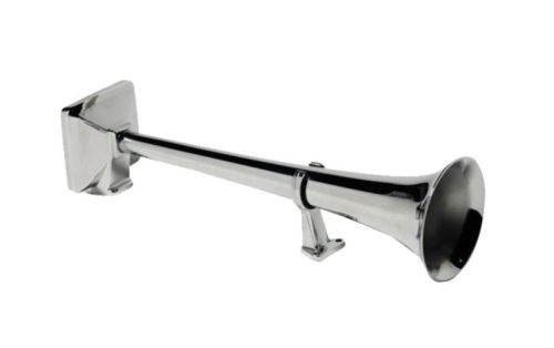 "Le HADLEY 856 est un claxon simple de 49 cm. Il a un bec rond à l'avant (diamètre 12,5 cm) et une partie arrière carrée. Une vraie version "Heavy Duty" qui peut prendre des coups ! Le Hadley est connu pour son son "chaud" et ses chromes de haute qualité. Il est généralement placé sur un côté du véhicule. Ce modèle peut également être monté en version double, chacun d'un côté, si deux sont commandés. Cet avertisseur pneumatique est fourni en standard SANS fonctionnement mais avec un pied d'appui à l'avant. kit de montage et de fonctionnement nécessaire exemple Réf. : 03402171 or 03402170 (pour 1 ou 2 claxons) vous pouvez aussi commandé toutes les pièces apart (= notre ref. 03381416 of 03389098) Le coupleur pour l'alimentation en air de ce klaxon peut être commandé séparément (= notre réf. 03381657 ou 03381362 ou 03381363 ou 03381364)"