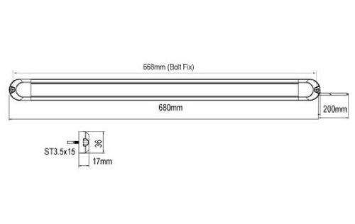 520 Lumens Warm White 12-24 Volts 30 x 0.2W LEDs IP67 Rated PC Lens Aluminium Housing Self Tap Bolt Mount (3.5*15 x2) Switch 200mm Cable Dimensions: 680*36*21mm Operating Temperature: -45C to +60C