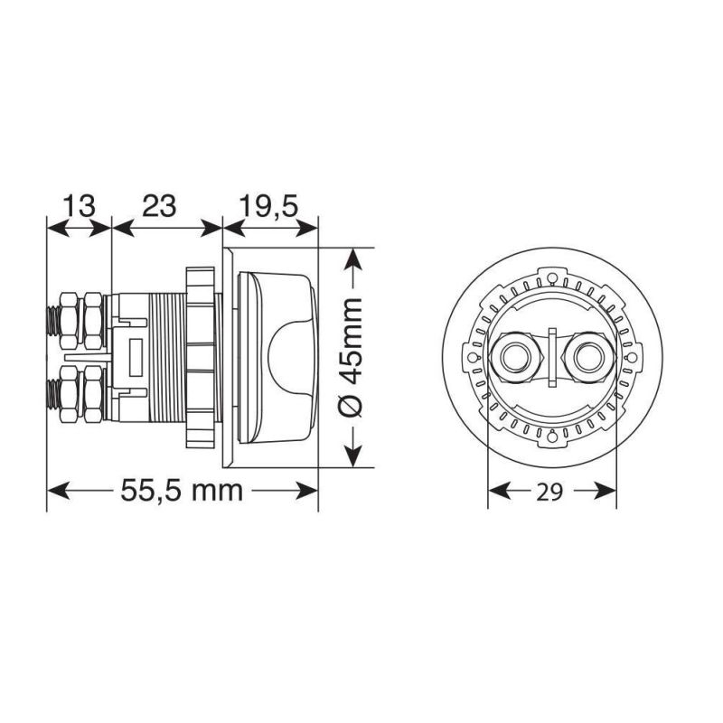 "Interrupteur d'arrêt, 3 fonctions, 12/32 V Coupe le circuit électrique principal. Préserve la batterie lors des stockages prolongés. Sécurité et protection antivol avec sélecteur amovible. Trou Ø 29 mm. 100 A max. Étanchéité IP56"