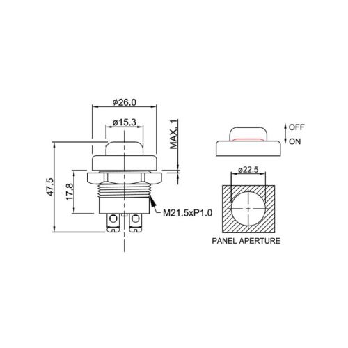 "Ce bouton-poussoir marche/arrêt est doté de deux connexions à vis et d'une ouverture de 22,5 mm. Caractéristiques : - Dimensions : 47,5 x 26 mm - Diamètre : 26 mm - Ouverture : Ø 22,5 mm - Longueur de la tige de montage : 17,8 mm - Filetage de la tige de montage : M21,5 x P1 - Connexion à vis"