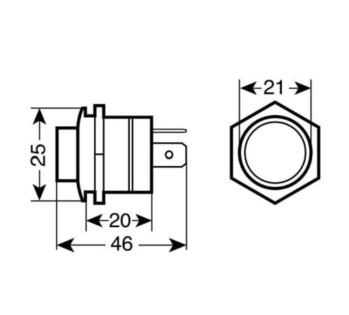 • 5 A max. • LED 2 fonctions: toujours allumée ou activée. • 3 bornes. • Trou Ø 22 mm. • Épaisseur 6 mm max.