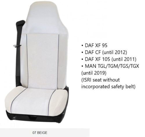• DAF XF 95 • DAF CF (jusqu'à 2012) • DAF XF 105 (jusqu'à 2011) • MAN TGL/TGM/TGS/TGX (jusqu'à 2019) (ISRI seat without incorporated safety belt)