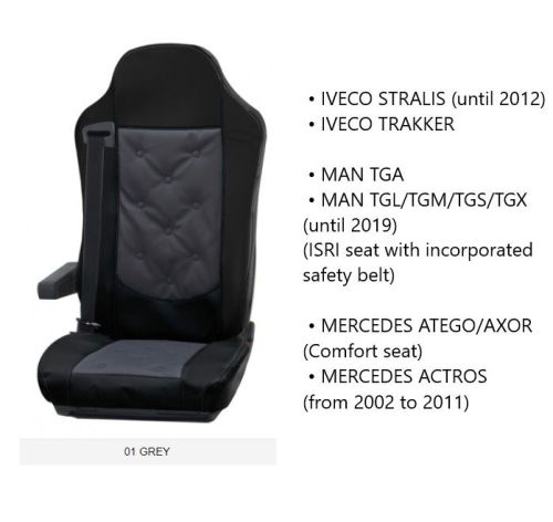 • IVECO STRALIS (jusqu'à 2012) • IVECO TRAKKER • MAN TGA • MAN TGL/TGM/TGS/TGX (jusqu'à 2019) (ISRI seat with incorporated safety belt) • MERCEDES ATEGO/AXOR (Comfort seat) • MERCEDES ACTROS (de 2002 à 2011)