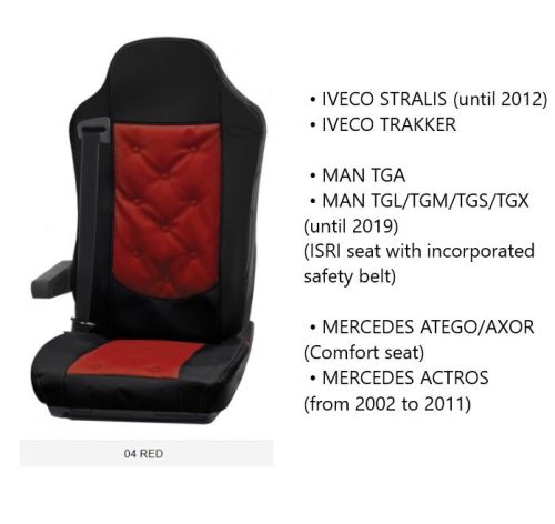 • IVECO STRALIS (jusqu'à 2012) • IVECO TRAKKER • MAN TGA • MAN TGL/TGM/TGS/TGX (jusqu'à 2019) (ISRI seat with incorporated safety belt) • MERCEDES ATEGO/AXOR (Comfort seat) • MERCEDES ACTROS (de 2002 à 2011)