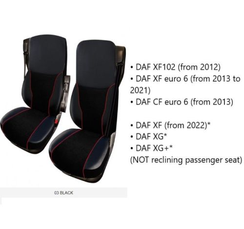 • DAF XF102 (a partir de 2012) • DAF XF euro 6 (de 2013 à 2021) • DAF CF euro 6 (a partir de 2013) • DAF XF (a partir de 2022)* • DAF XG* • DAF XG+* (Siège passager non réglable)