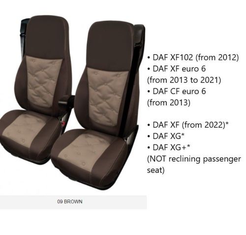 • DAF XF102 (a partir de 2012) • DAF XF euro 6 (de 2013 à 2021) • DAF CF euro 6 (a partir de 2013) • DAF XF (a partir de 2022)* • DAF XG* • DAF XG+* (Siège passager non réglable)