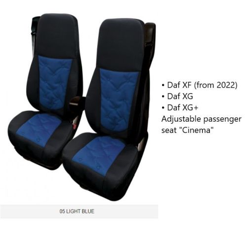 •Pour Daf XF new - XG - XG+ 2021-> •Siège passagier "CINEMA" pliable (sans tablette!) •Combinaison noir/bleu •Cuir synthétique •Housses sur mesure! •Par jeu = 2 pièces