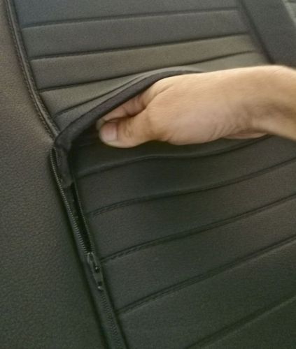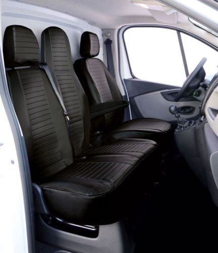 "Renault Traffic 2014-> WITH tablette dans siège passagier • Cuir semili NOIR • Trou pour ceintures de sécurité • Ouverture avec zip pour plateau (si nécessaire) • Ouvertures pour accoudoirs, poignée de réglage lombaire et levier de siège inclinable (si nécessaire) • Housse de banquette séparée (le cas échéant) • Housse de dossier de siège double (le cas échéant)"