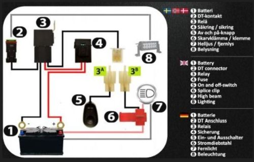 "Relais avec connecteur DT et bouton pour une connexion facile de la lumière auxiliaire ou de la barre LED. Un éclairage externe ou une barre LED n'a besoin que d'un seul connecteur DT. Deux lumières nécessitent deux connecteurs DT, etc. Contrôlez votre lumière auxiliaire avec le bouton d'alimentation idéalement situé à l'intérieur du véhicule ou en vous connectant directement au feu de route (la lumière extérieure s'allumera automatiquement lorsque vous passerez à votre feu de route et s'éteindra lorsque vous reviendrez au feu de croisement). Fonctionne avec les véhicules avec et sans Canbus. • 4 connecteurs DT • relais 24V 40A • Interrupteur • Fusible jusq'à 80A"