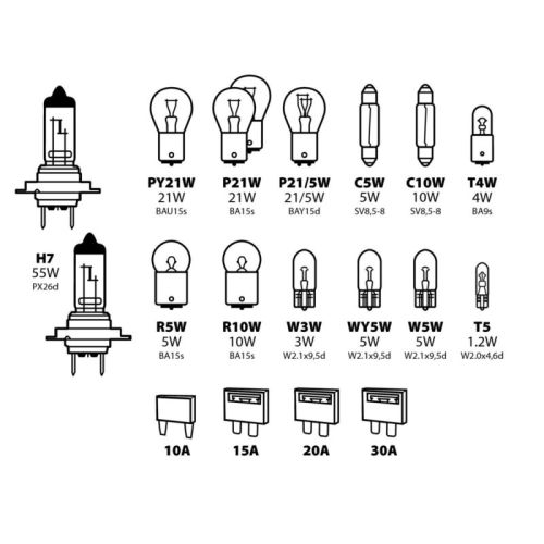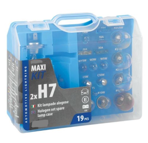 "Kit lampes de rechange 19 pcs, 12V - 2x halogène H7 Jeu de 15 lampes + 4 fusibles. Homologation européenne"